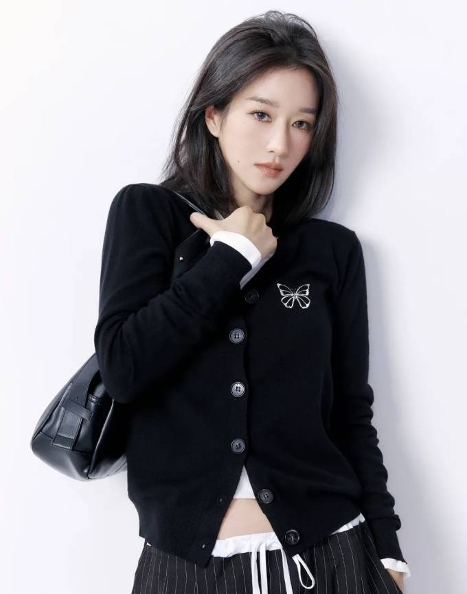 서예지는 나비 자수가 포인트로 들어간 블랙 카디건에 스트라이프 팬츠를 매치해 담백하면서도 고급스러운 무드를 완성했다.