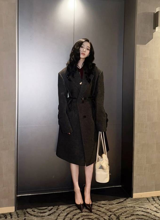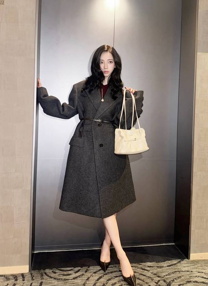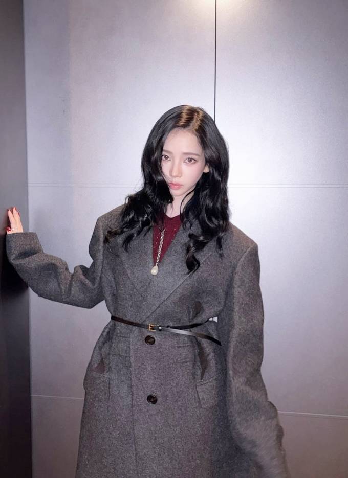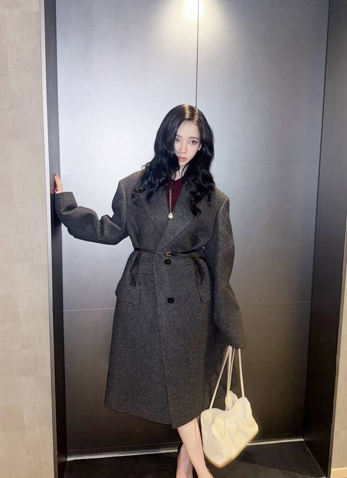 공개한 사진에서 카리나는 차분한 차콜 그레이 컬러의 오버핏 코트를 착용해 세련된 분위기를 자아냈다. 허리를 슬림하게 잡아주는 벨트 디테일로 실루엣을 강조해 시크함 속에서도 여성스러운 라인을 살렸다.