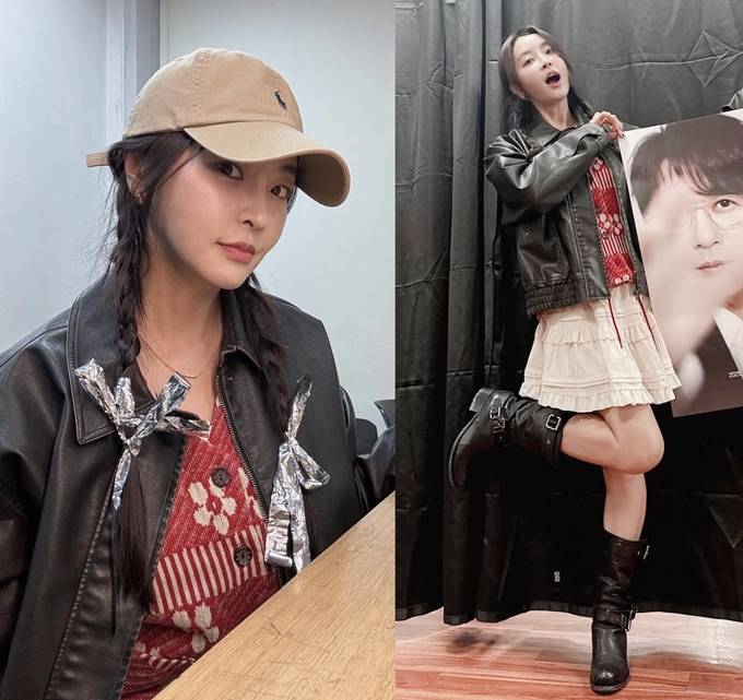 여기에 블랙 레더 재킷과 버클 롱부츠를 더해 귀여움 속에서도 시크한 반전 매력을 선보였다.