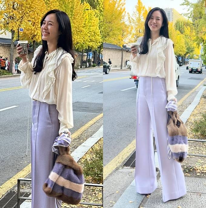 배우 박주미가 러플 블라우스와 라벤더 팬츠의 가을룩으로 가을 거리를 내추럴한 우아미로 가득 채웠다.