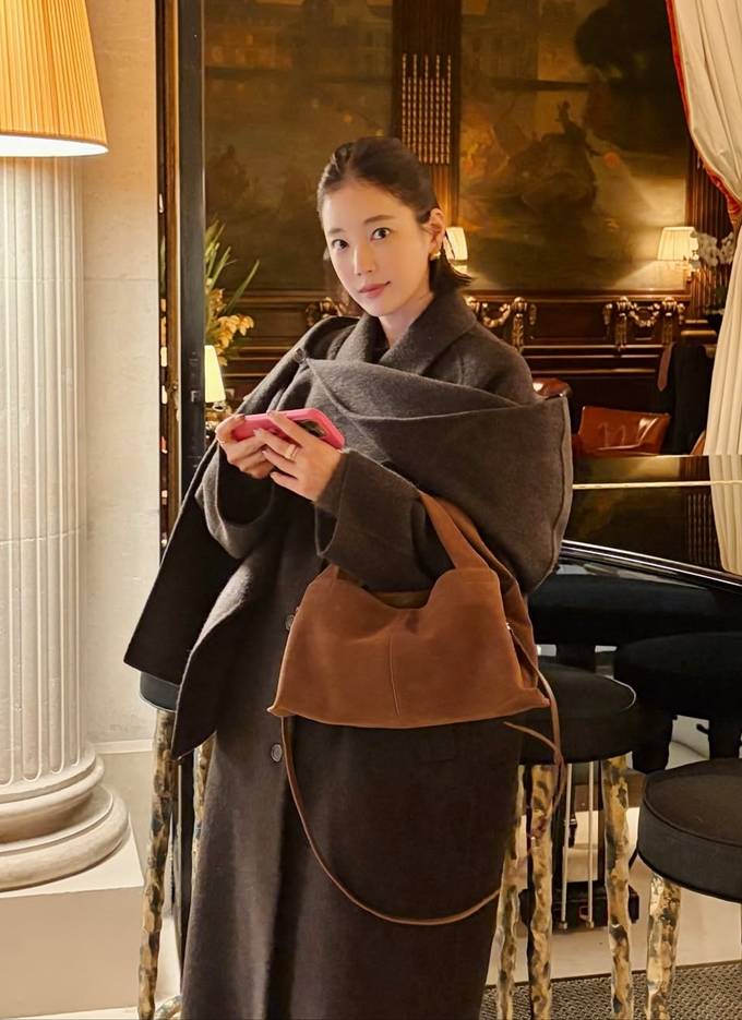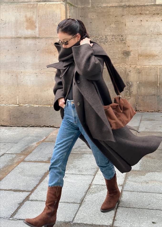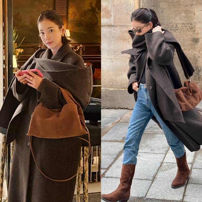 또 여기에 부드러운 스웨이드 브라운 백과 부츠를 매치해 스타일리시한 파리지앵 분위기를 자아냈다.