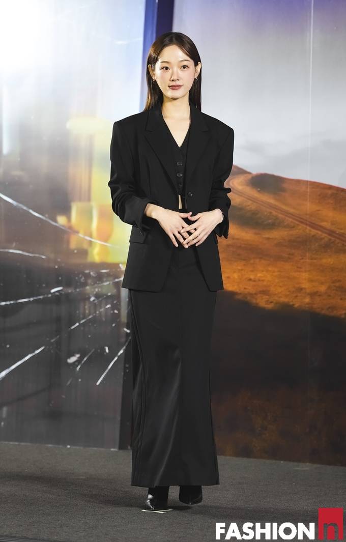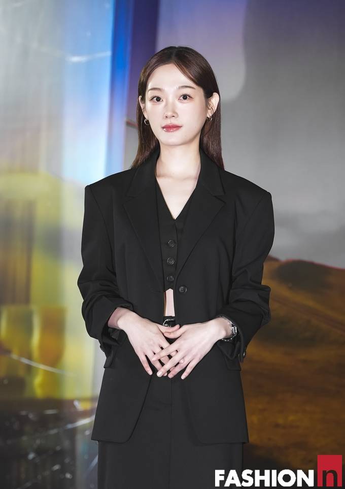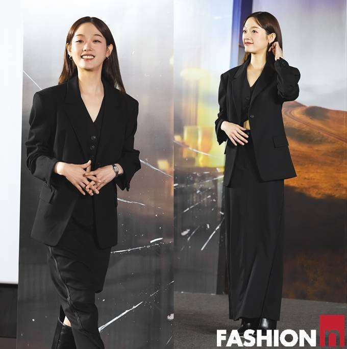 배우 이유미가 블랙 오버핏 재킷에 롱 스커트의 올 블랙 슈트룩으로 성숙해진 프로페셔널한 분위기를 물씬 드러냈다.