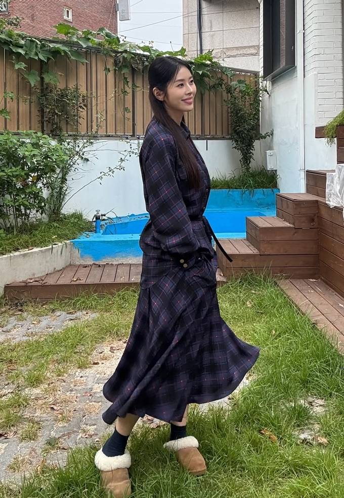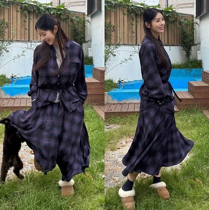 공개한 사진에서 서동주는 잔잔한 체크 패턴의 셔츠 재킷과 플리츠 롱 스커트 셋업으로 가을 감성을 가득 담은 마당 산책룩을 선보였다.