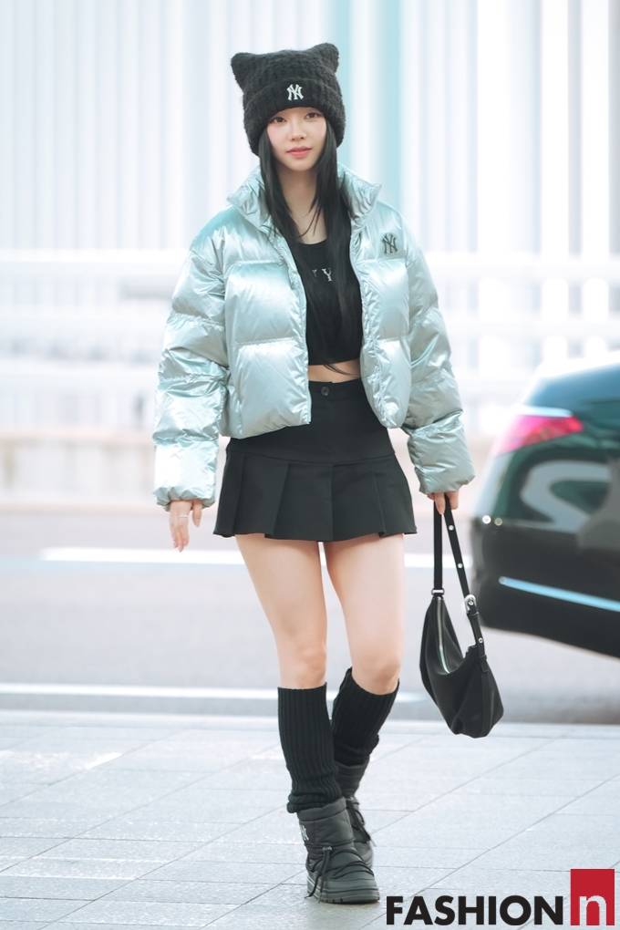 여기에 니삭스와 패딩 부츠로 스타일과 보온을 모두 챙겼으며, 블랙 숄더백으로 깔끔하게 마무리했다.