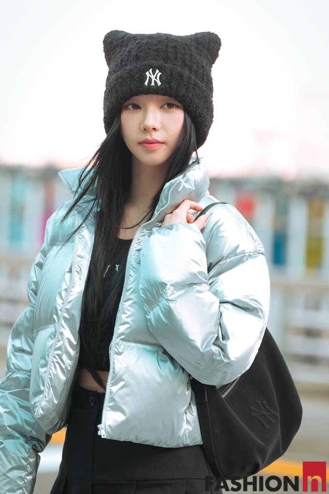 이날 카리나는 귀여운 고양이 귀 모양의 블랙 니트 비니에 블랙 플리츠 미니 스커트와 메탈릭 실버 컬러의 숏패딩을 입고 애니를 뚫고 나온 요정 같은 미모를 드러냈다.