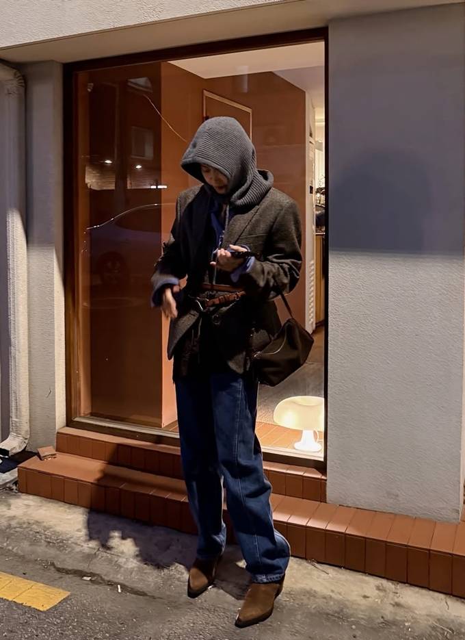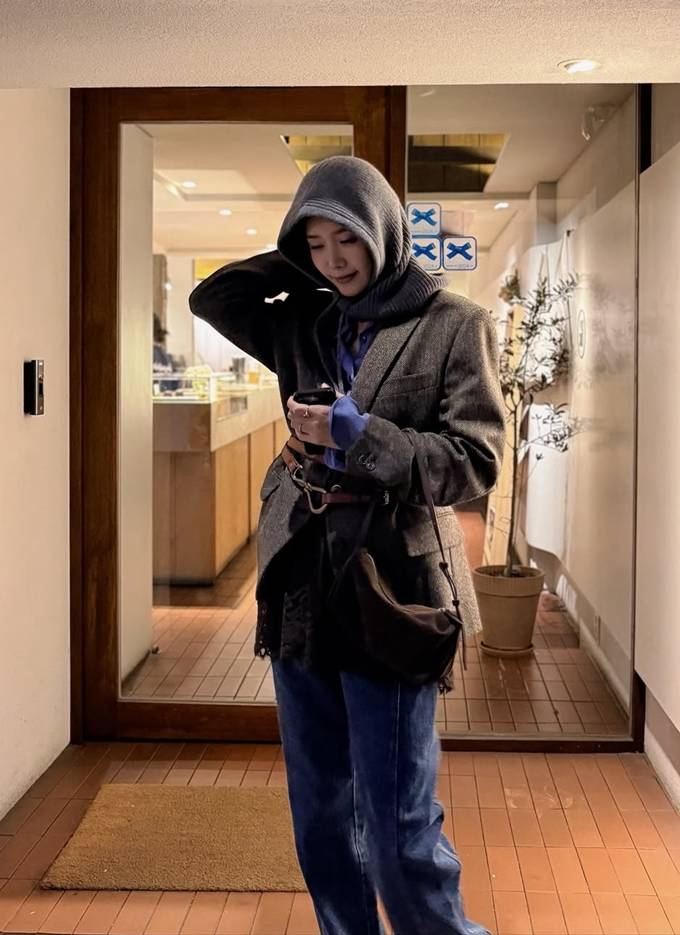 공개한 사진에서 채정안은 클래식한 브라운 헤링본 재킷 안에 블루 셔츠를 레이어드하고, 그 위에 그레이 니트 바라클라바를 착용해 세련된 밤 외출 스타일을 연출했다.