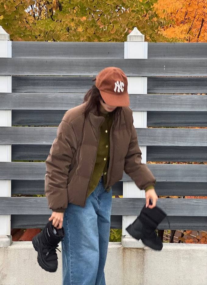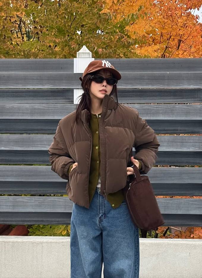초코 브라운 패딩룩에는 카키 셔츠와 데님 팬츠, 볼캡과 선글라스를 매치해 쿨한 스트릿 감성을 연출했다.