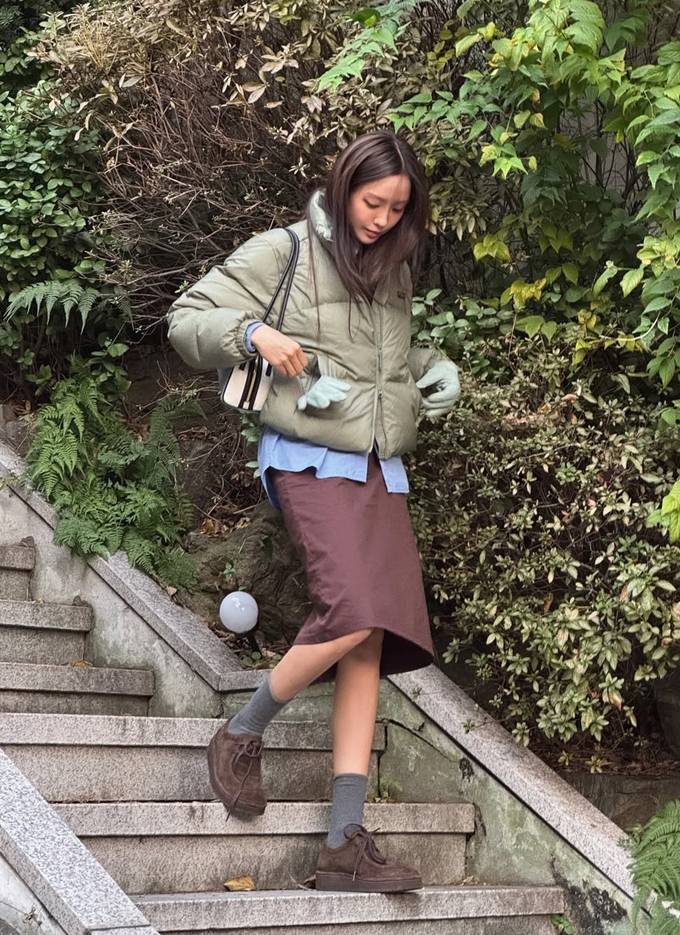 반면 민트 패딩룩에서는 블루 셔츠와 버건디 스커트를 레이어드해 부드럽고 감각적인 분위기를 자아냈다.
