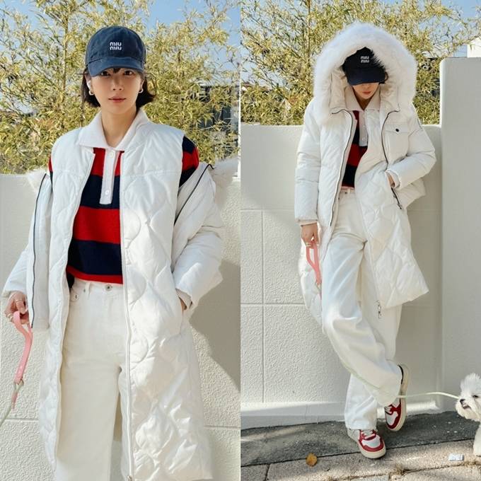지난 10월 에코 퍼 재킷을 입어 베스트 제품에 등극시킨 기은세가 이달에는 화이트 컬러의 더블 레이어 다운을 활용한 편안하고 고급스러운 겨울 데일리룩을 선보였다.