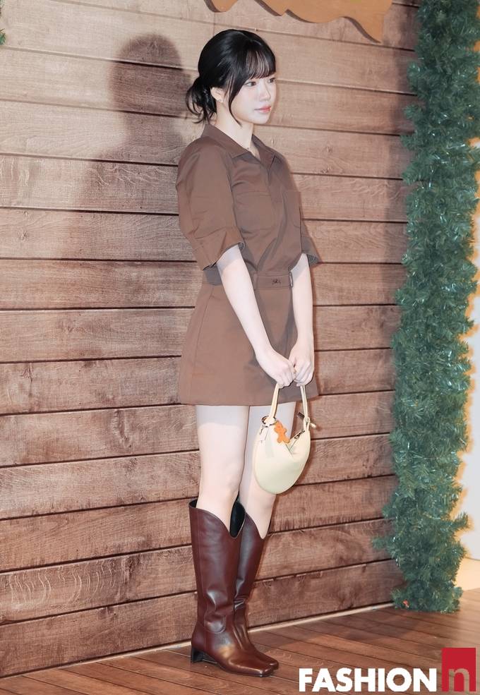 이날 조유리는 브라운 컬러의 셔츠와 미니 스커트 셋업에 롱부츠를 매치한 나들이룩으로 세련되면서도 트렌디한 무드를 선보였다.