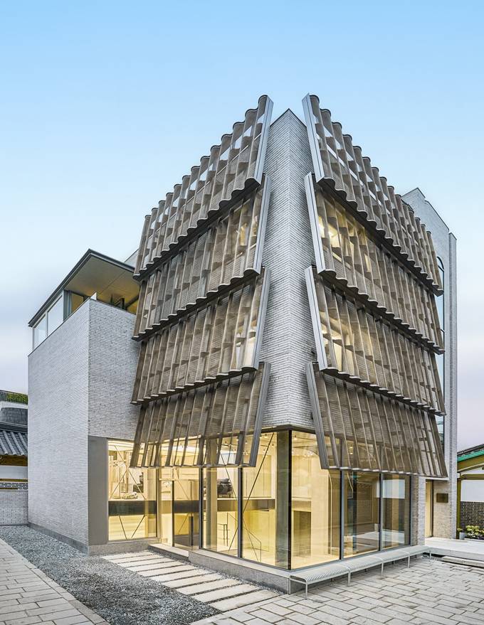 외관은 한옥 지붕 선에서 착안해 전통 기와의 형태를 금속으로 구조물을 구현해 현대적인 건축미를 강조했다.