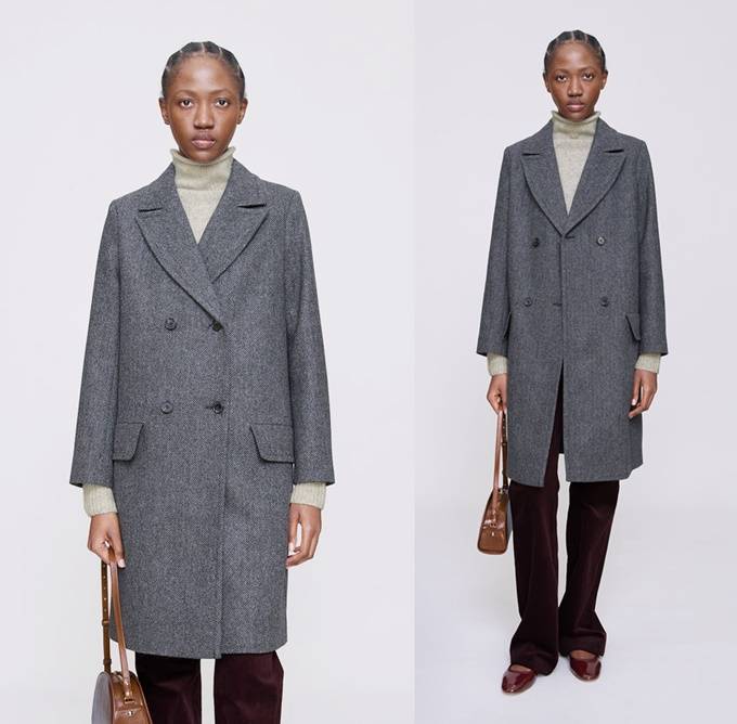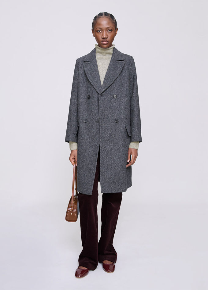 프렌치 컨템포러리 브랜드 '아페쎄(A.P.C.)' 헤링본 코트는 차콜 그레이 컬러와 빅 칼라, 더블브레스티드 여밈의 겨울 든든템으로 멋스러운 아웃핏을 선사한다.