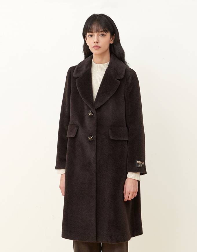 고급 알파카 혼방 원단으로 완성된 코트 제품으로 앙 중심의 플라워 비즈 장식의 스냅 버튼이 세련된 포인트가 되어 페미닌하고 고급스러운 무드를 완성한다.