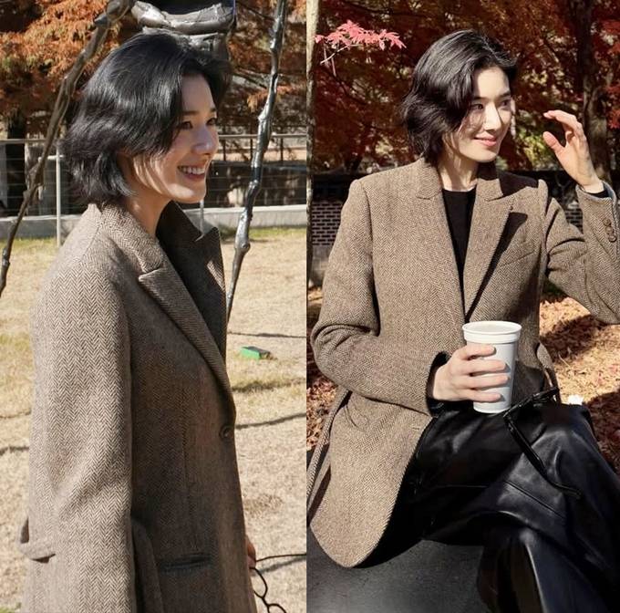 공개한 사진에서 정은채는 헤링본 재킷에 블랙 레더 팬츠를 매치한 나들이룩으로 힙하면서도 시크한 스타일을 완성했다.