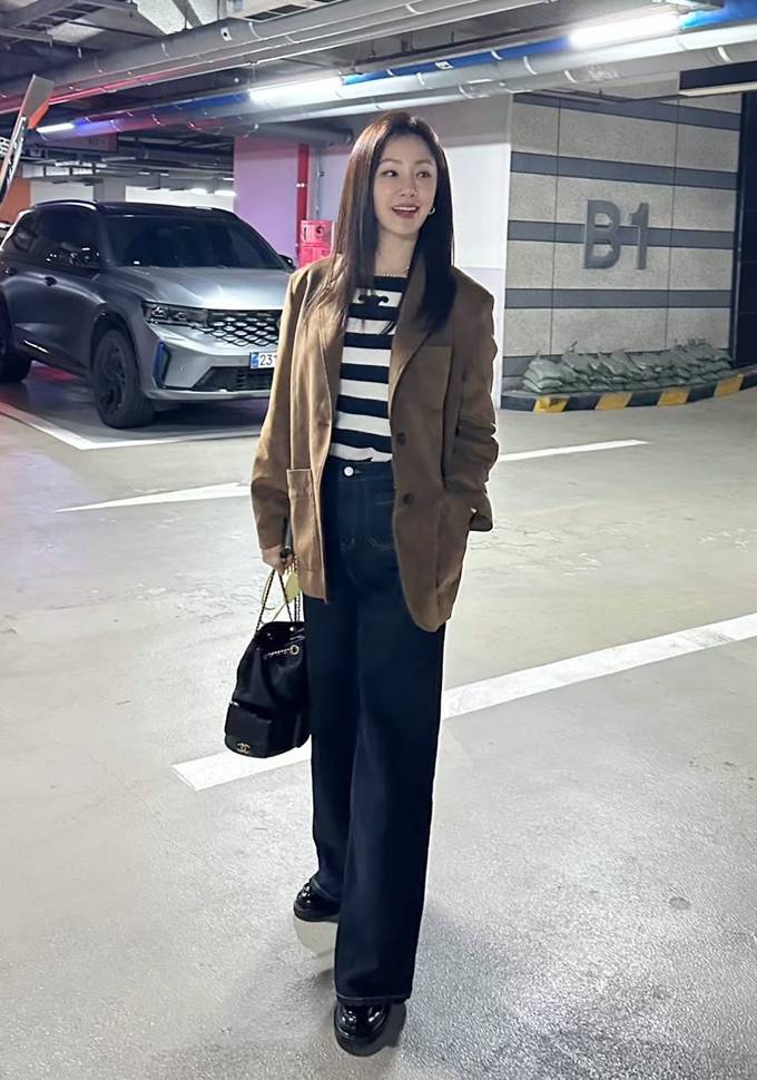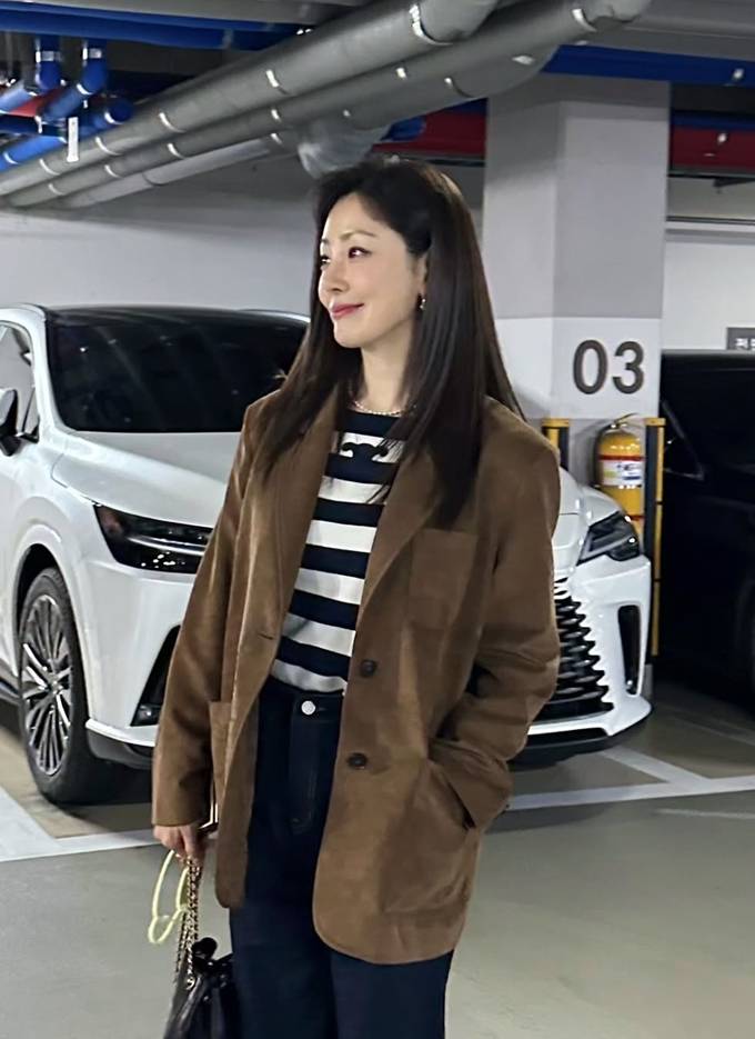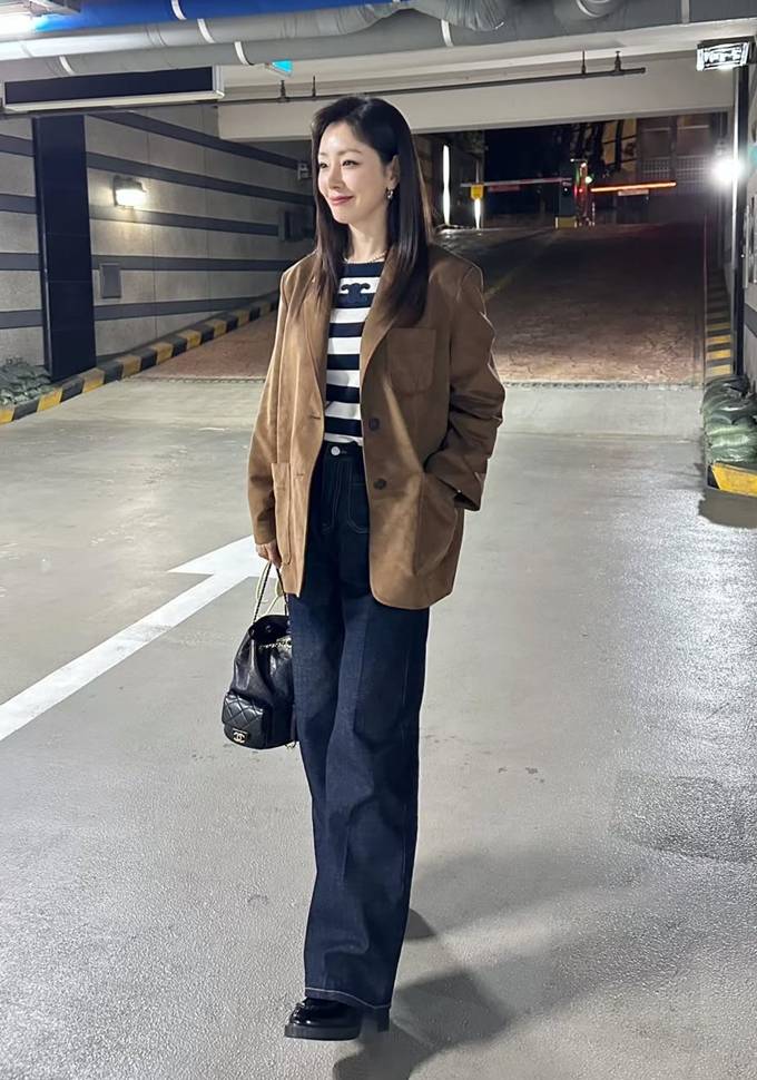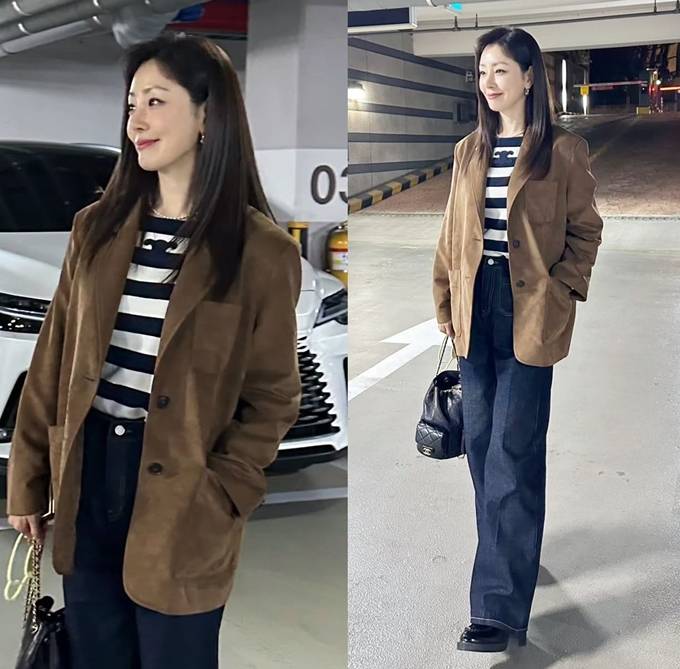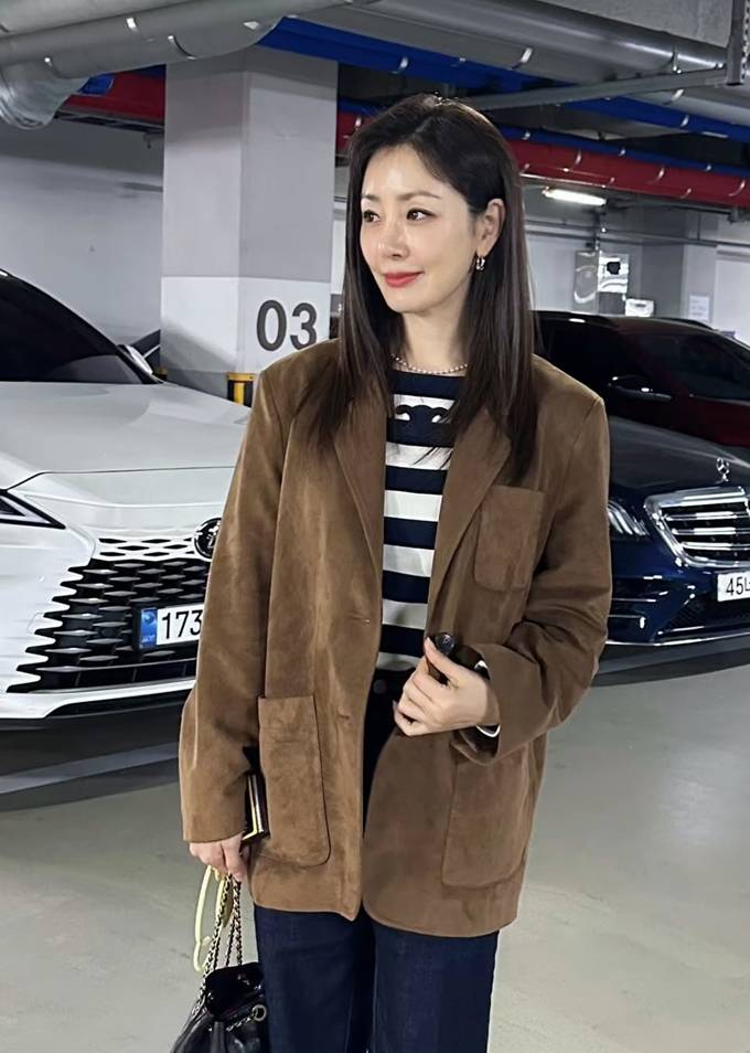배우 오나라가 스트라이프 티셔츠에 스웨이드 재킷을 매치한 데일리룩으로 멋스러운 일상 현실 패션을 완성했다.