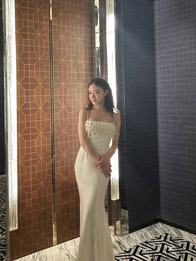 공개한 사진에서 이세영은 가느다란 스파게티 스트랩과 함께 앞면에 풍성하게 장식된 비딩 디테일이 눈길을 끄는 슬림 핏의 화이트 백리스 드레스룩으로 로맨틱하면서도 청순한 분위기를 자아냈다.