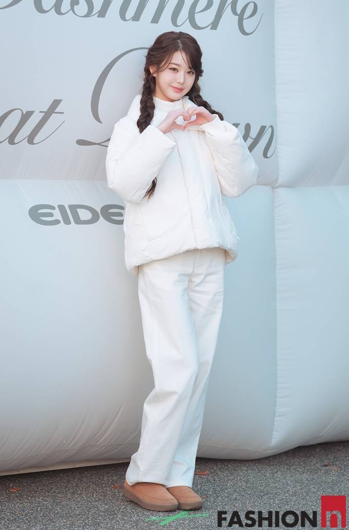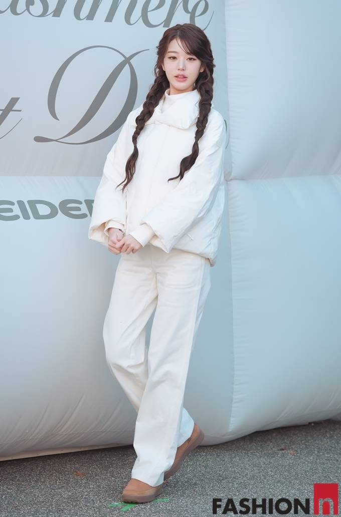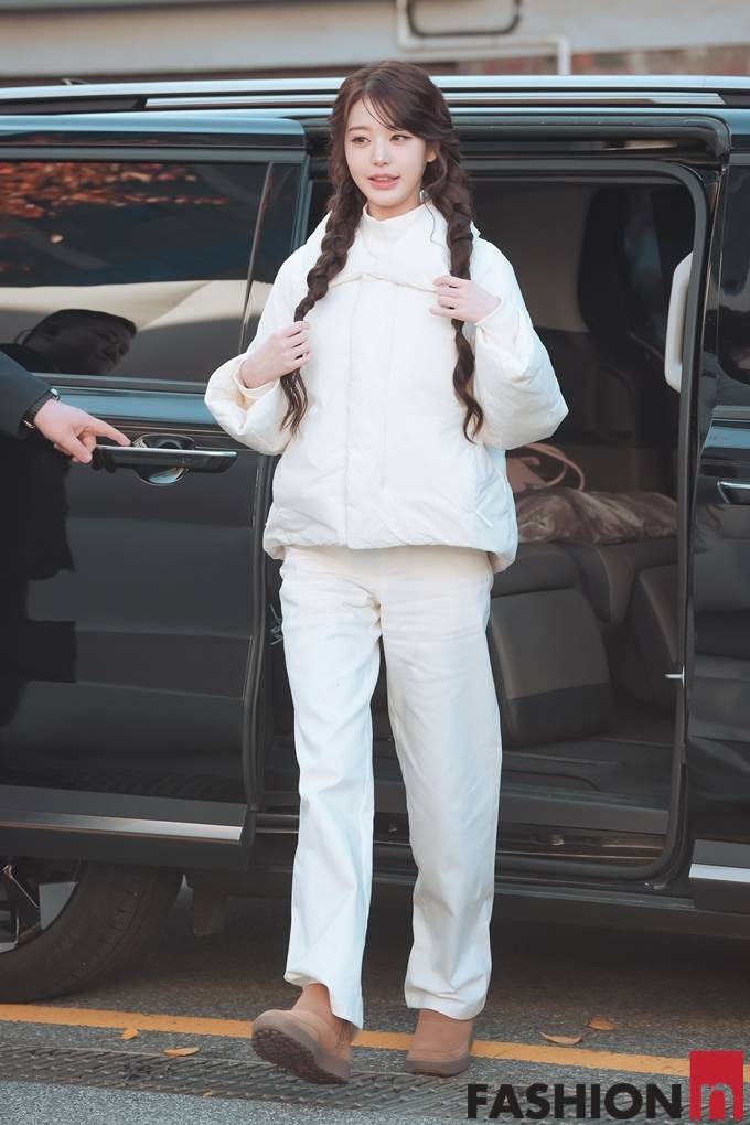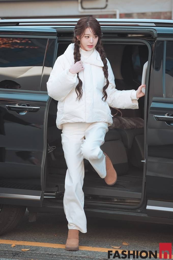 이날 장원영은 귀여운 양갈래 굵게 땋은 머리에 화이트 상의 패딩, 와이드 팬츠를 입고 브라운 어그 부츠를 매치한 올 화이트룩으로 러블리한 미모를 뽐냈다.