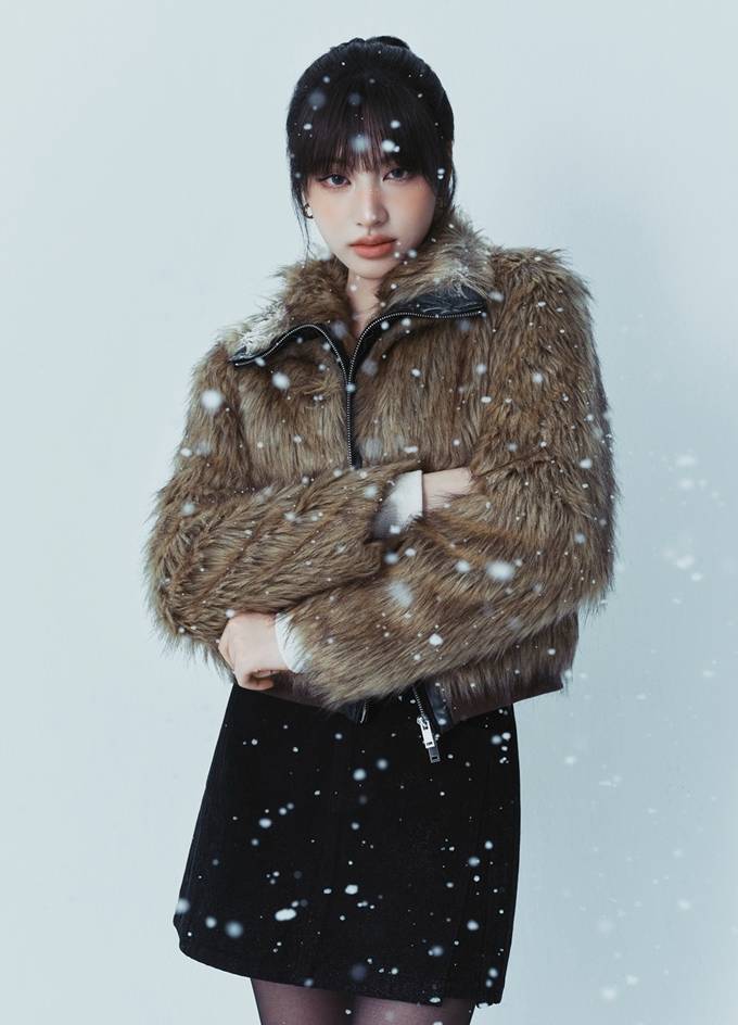갈색 퍼의 풍성한 질감이 돋보이는 블루종에 데님 미니 스커트를 조합해 강렬한 매력을 드러냈다.