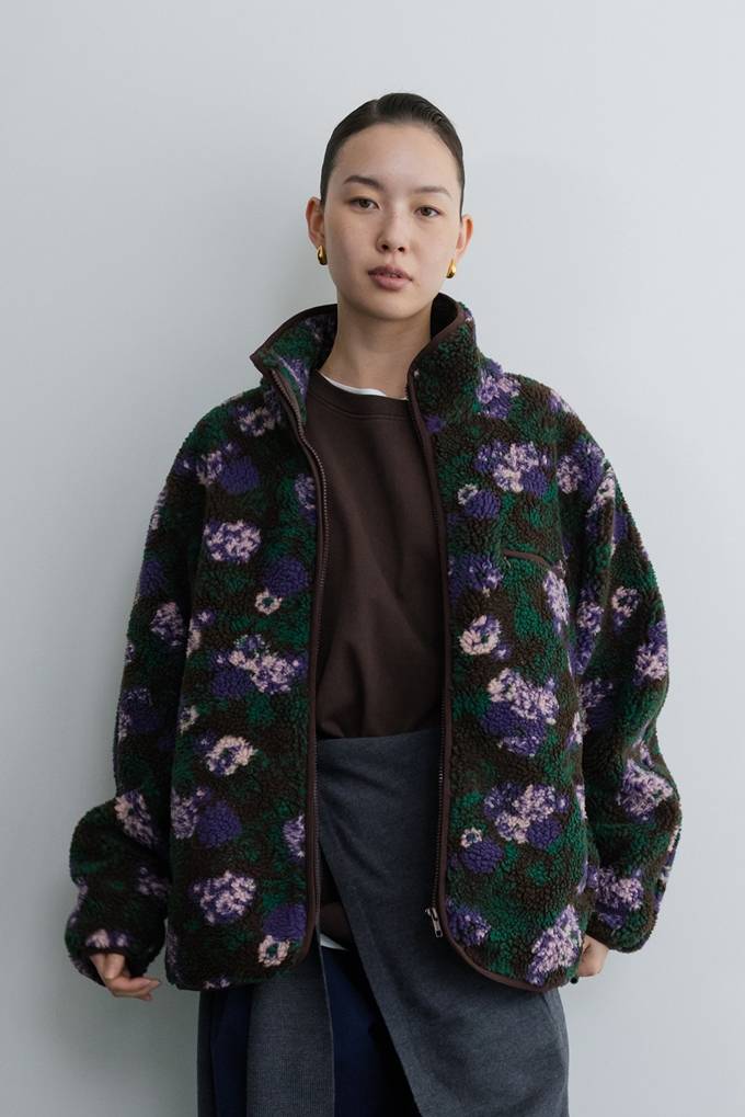 앞여밈, 밑단, 암홀 라인에 몽글몽글한 털을 더한 시어링 베스트와 꽃무늬 플리스 점퍼를 매치해 귀여운 감성의 스타일링을 제안하기도 했다.