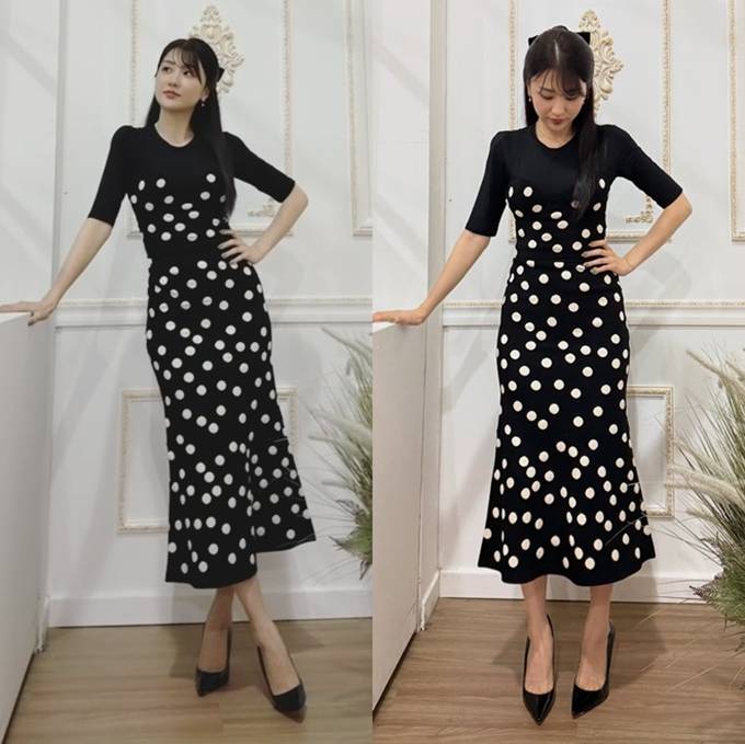 공개한 사진과 영상에서 박하선은 블랙 반팔 티셔츠에 화이트 도트 디자인이 들어간 뷔스티에 원피스로 우아하면서도 발랄한 출근 스타일을 선보였다.