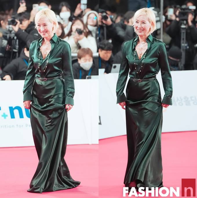 이날 이혜영은 짧은 금발 헤어 스타일에 에멜랄드 그린의 셔츠 드레스룩으로 62세 나이가 믿기지 않는 우아하면서도 카리스마 넘치는 분위기를 자아냈다.