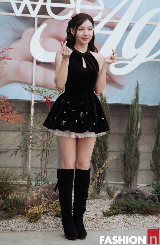 이날 나연은 화이트 치마 자락이 살짝 노출된 블랙 홀터넥 미스 원피스룩으로 러블리하면서도 귀여운 요정미를 발산했다.