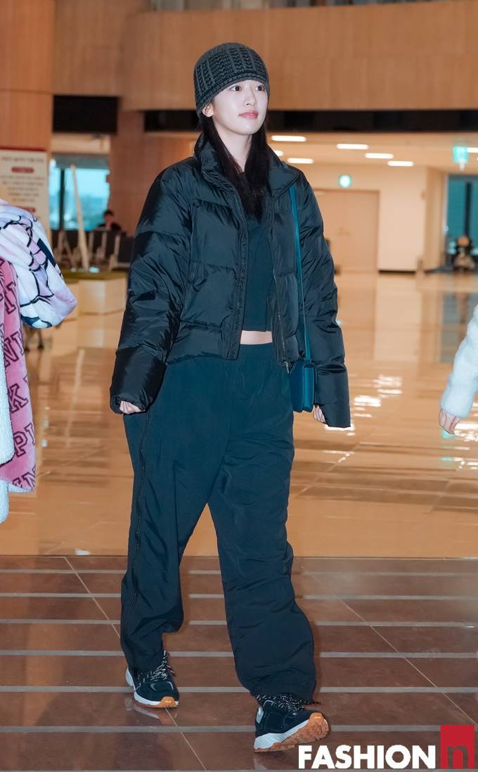 이날 안유진은 볼륨감 있는 크롭 패딩에 여유로운 핏의 블랙 조거 팬츠와 허리 라인이 살짝 드러난 블랙 톱에 니트 비니를 매치한 출국룩으로 편안하면서도 힙한 스타일을 선보였다.