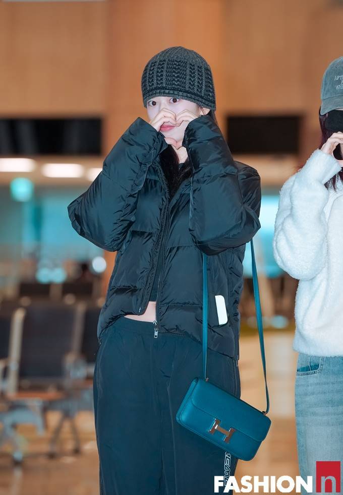 그룹 아이브의 안유진이 숏패딩에 비니와 오버핏 팬츠를 찰딱같이 소화하며 힙한 출국룩으로 시선을 사로잡았다.