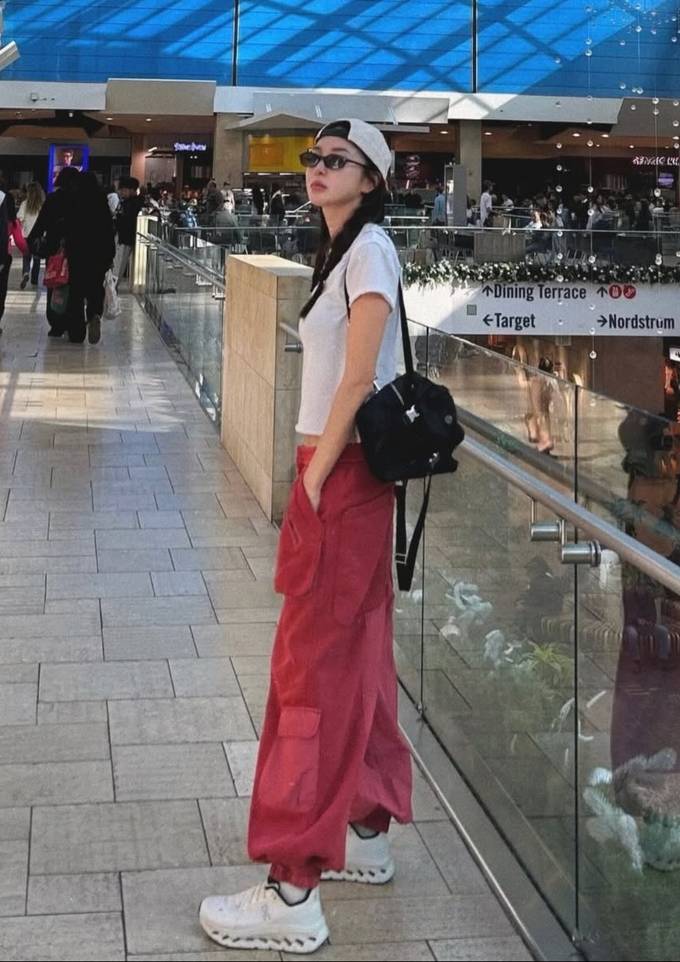 김윤지는 허리 라인이 살짝 드러난 화이트 크롭 티셔츠에 여유로운 실루엣과 커다란 포켓디테일이 돋보이는 레드 카고 팬츠를 매치한 슬림한 실루엣으로 트렌디하면서도 힙한 걸리시룩을 완성했다.
