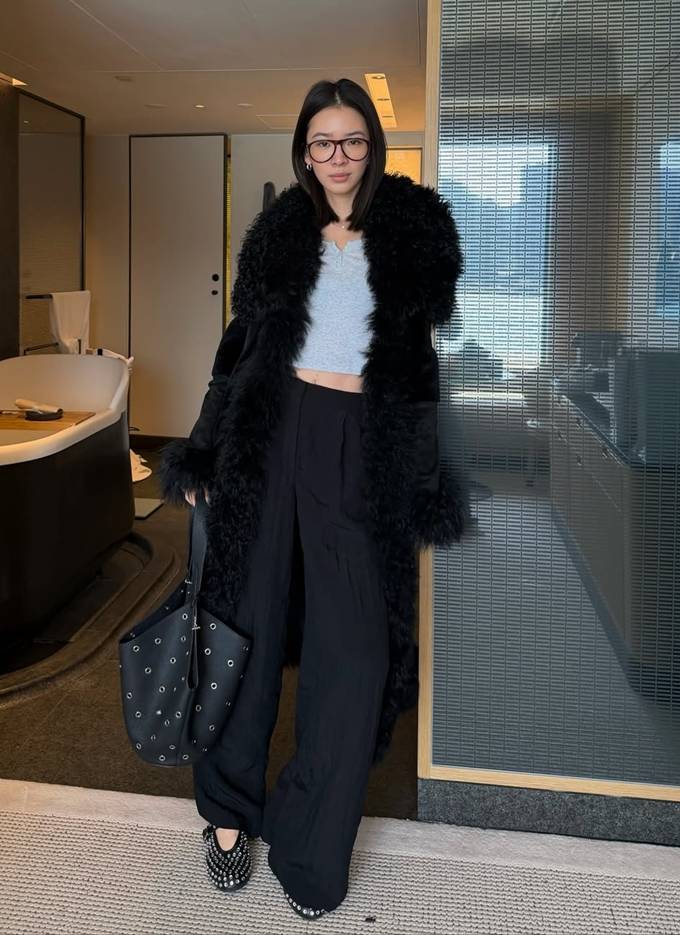 공개한 사진에서 아이린은 블랙 퍼 트리밍의 롱 코트에 이너로 허리가 드러난 크롭 톱을 입고 와이드 핏 블랙 팬츠를 매치한 데일리룩으로 시크한 스타일을 완성했다.