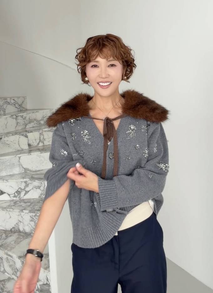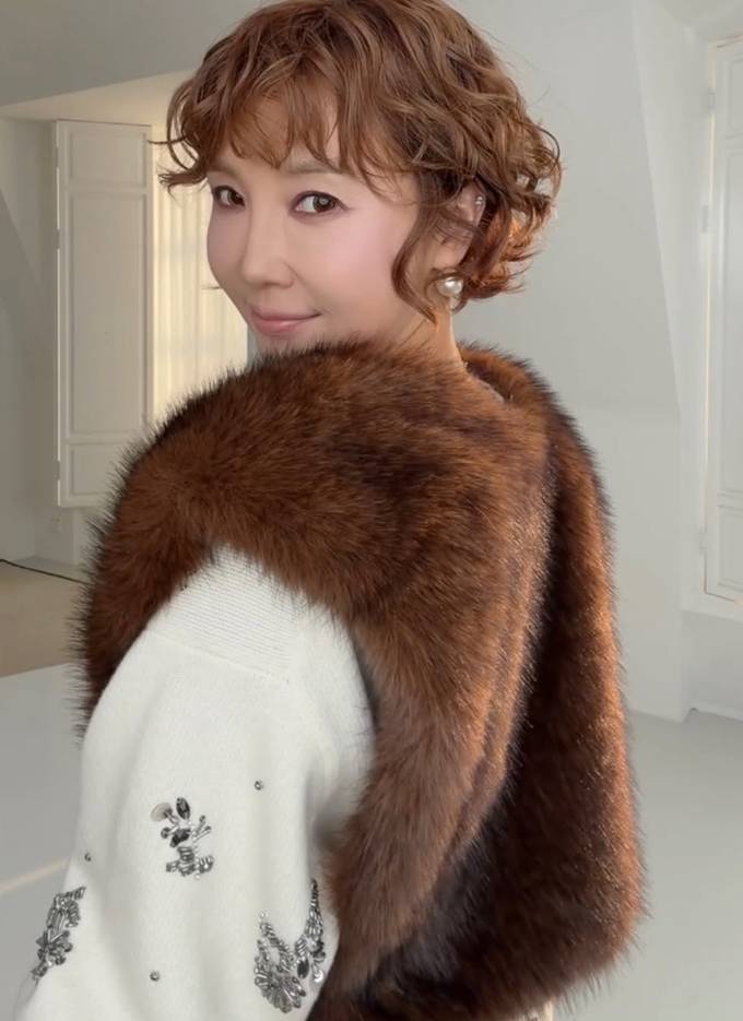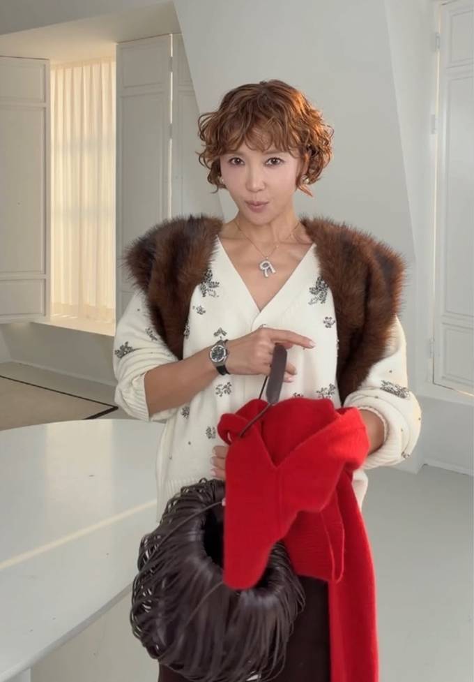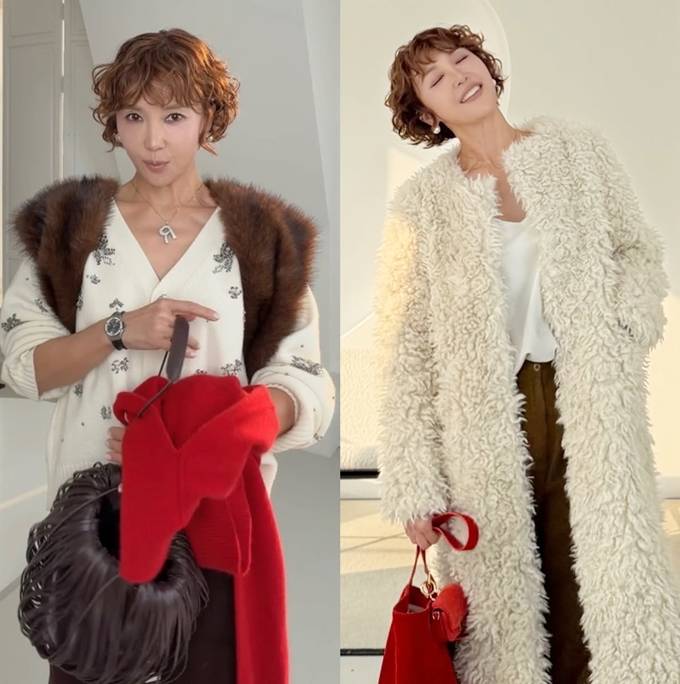 공개한 사진에서 최은경은 양털 퍼 코트와 브라운 퍼 베스트, 브라운 퍼 카라와 니트 카디건으로 스타일링한 포근하고 스타일리시한 모임룩을 선보였다.