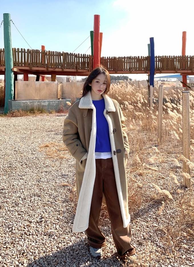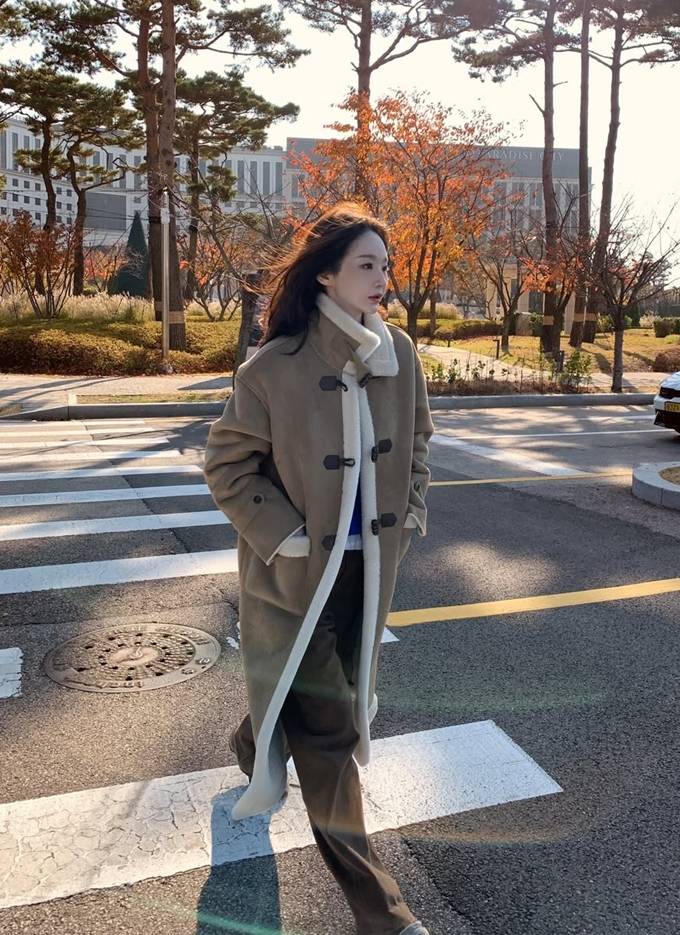 여성 듀오 그룹 다비치의 강민경이 이불 밖으로 나오기 싫은 날 포근한 하이넥 무스탕 코트로 외출을 감행했다.
