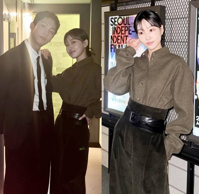 공개한 사진에서 하윤경은 카키 컬러의 롱 스커트에 블랙 벨트를 매치하고 동일한 컬러의 셔츠를 매치한 톤온톤 나들이룩으로 더 길어 보이는 슬림한 실루엣을 강조했다.