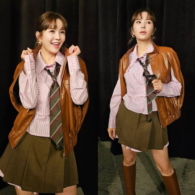 공개한 사진에서 장영란은 핑크 톤의 스트라이프 셔츠에 타이를 매고 브라운 레더 베스트를 입고 카키톤의 플리츠 미니 스커트를 매치해 발랄함과 세련미 넘치는 프레피룩을 완성했다.