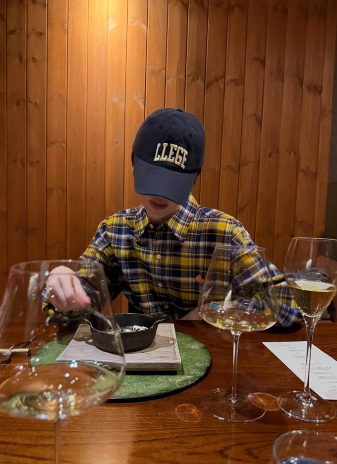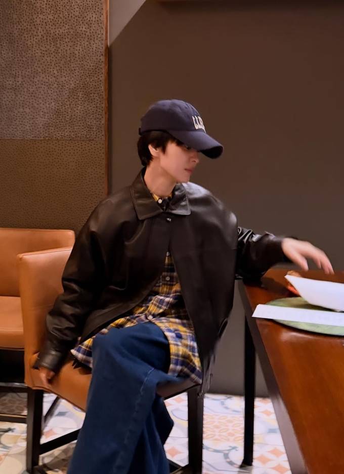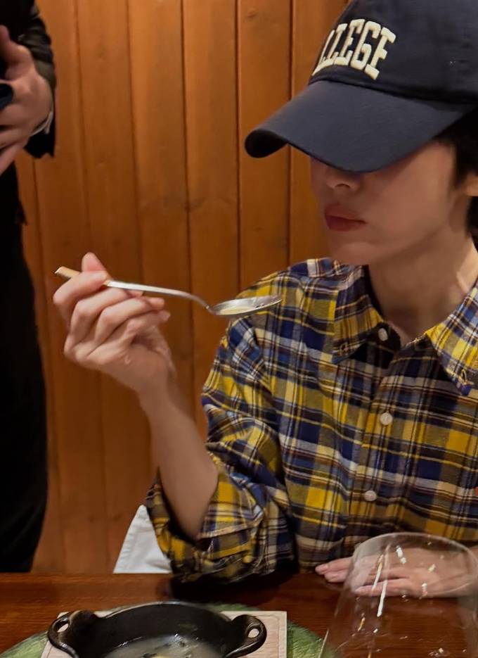 공개한 사진에서 송혜교는 옐로와 네이비 체크 셔츠와 일자 와이드 데님 팬츠를 입고 여유로운 실루엣의 레더 재킷을 걸친 외출룩으로 모던하면서도 보이시한 데이트룩을 완성했다.