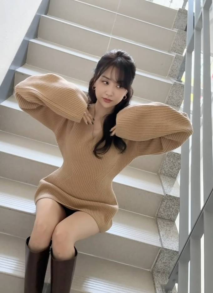 공개한 사진과 영상에서 박하선은 초미니 블랙 쇼츠 위에 오버핏 카멜 니트 스웨터를 착용한 하의실종 스타일로 과감하면서도 섹시한 출근룩을 완성했다.