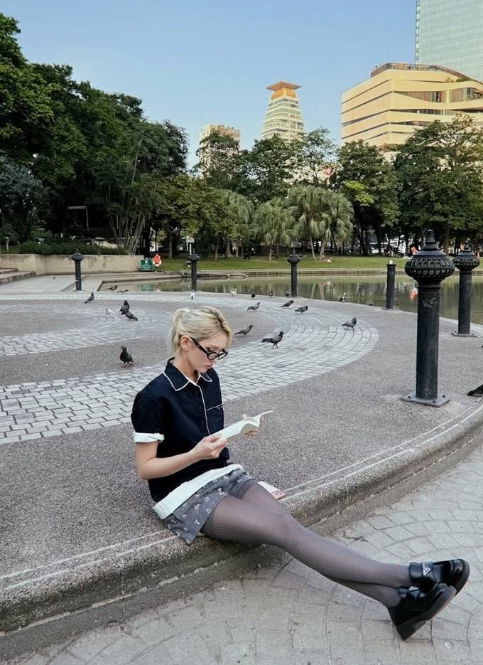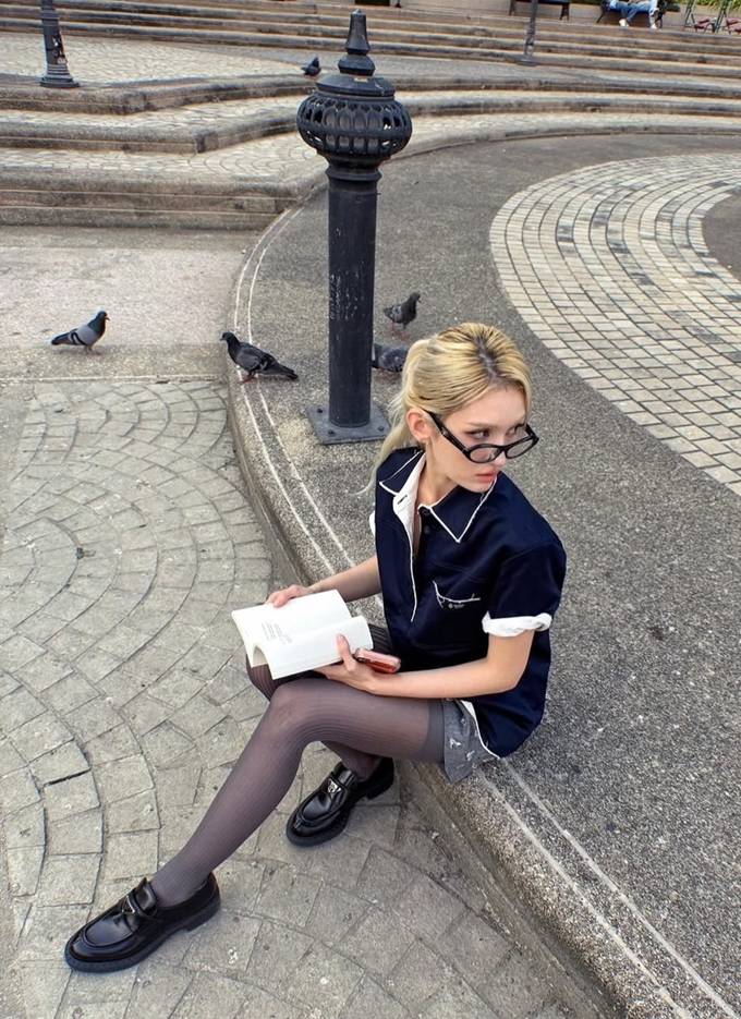 또 블랙 스타킹에 블랙 로퍼를 매치해 완성도 높은 긱시크룩을 선보였다.