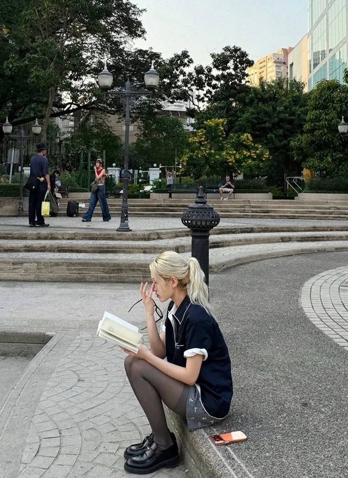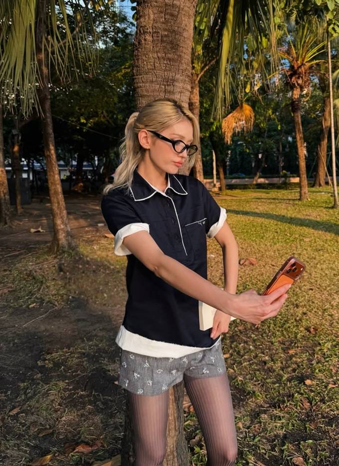 가수 전소미가 싱가포르에서 쇼츠에 뿔테 안경을 쓴 핫한 스타일로 앉아만 있어도 화보 같은 긱시크룩을 선보였다.