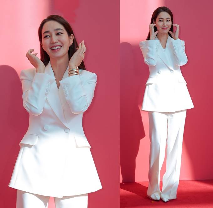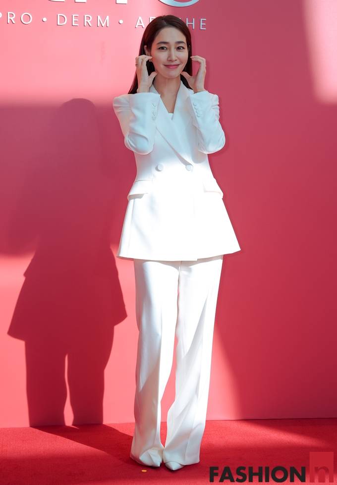 이날 이민정은 허리 라인에 살짝 힘을 준 화이트 더블 재킷에 화이트 팬츠를 매치한 테일러드 슈트룩으로 클래식하면서도 멋스러우면서도 절제미를 뽐냈다.
