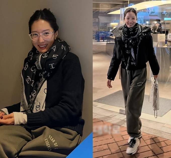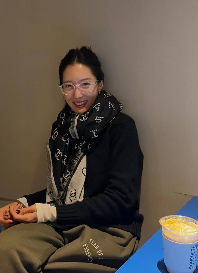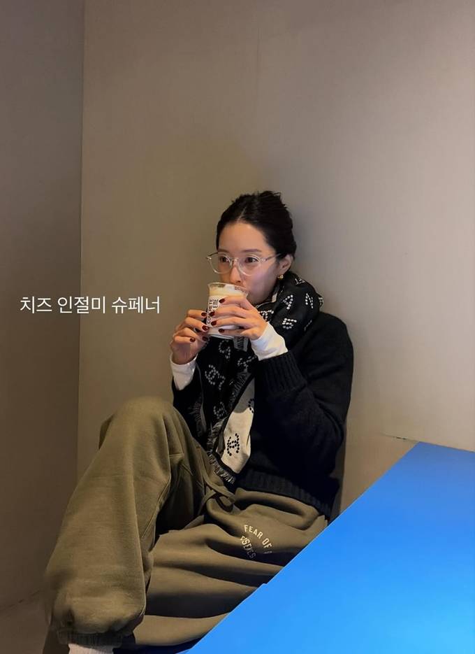 또 여기에 스카프 머플러를 두르고 뿔테 안경을 매치해 멋스러운 겨울 외출 스타일을 완성했다.