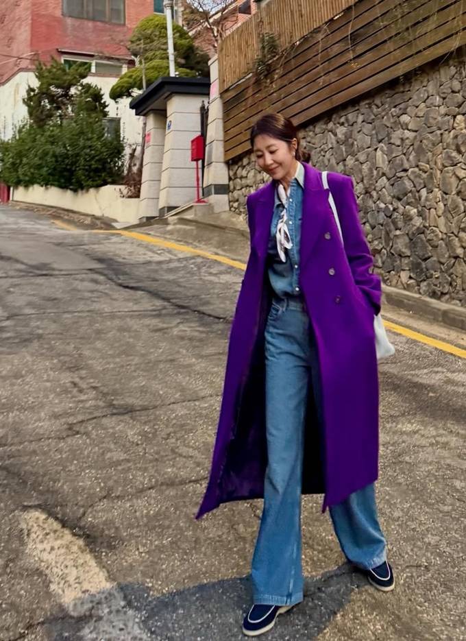 공개한 사진에서 전미라는 데님 팬츠와 데님 셔츠의 청청 패션에 클래식한 더블 버튼의 퍼플 롱 코트를 걸친 감각적인 컬러의 매치의 외출룩으로 시선을 단번에 사로잡았다.