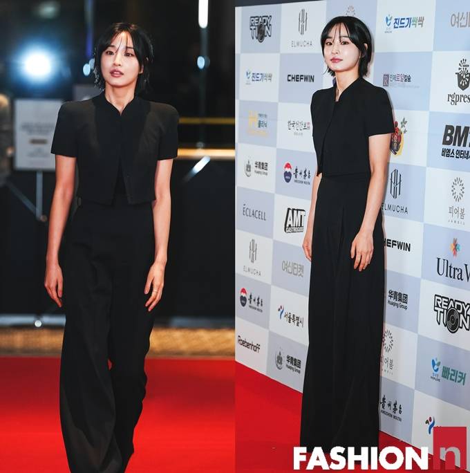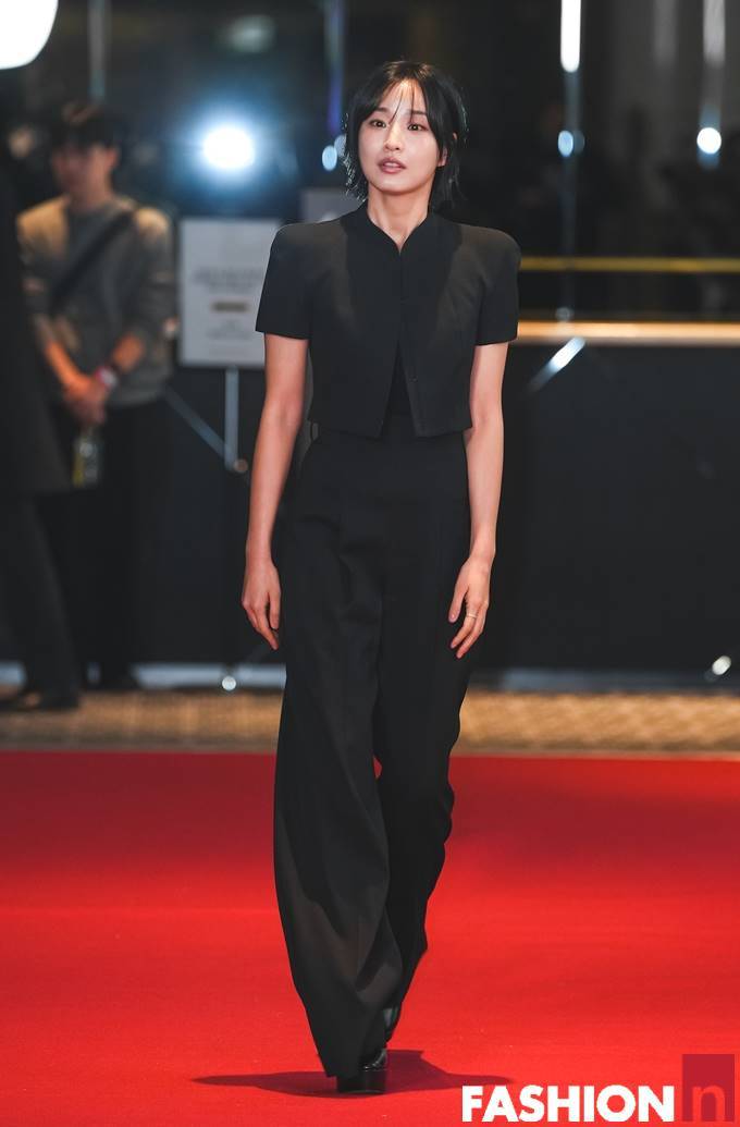 이날 방효린은 숏컷 헤어 스타일에 블랙 크롭 재킷과 블랙 팬츠의 올 블랙 슈트룩으로 청순하면서도 단단한 앳된 미모를 발산했다.