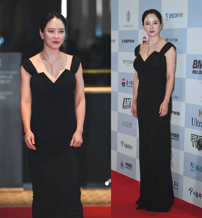 영화배우가 선정한 최고 배우상을 받은 송지효는 이날 초밀착 블랙 드레스룩으로 시선을 사로잡았다.