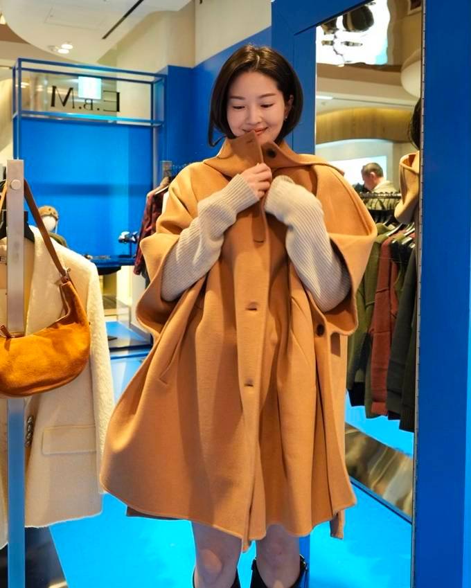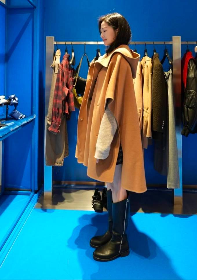 ▶ 전진 아내 류이서는 지난 10월 ‘이비엠(E.B.M)' 신세계 강남점 팝업스토어 방문 당시 클래식한 카멜 케이프 코트룩으로 백화점 나들이룩을 완성했다.