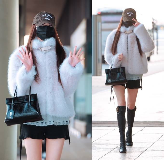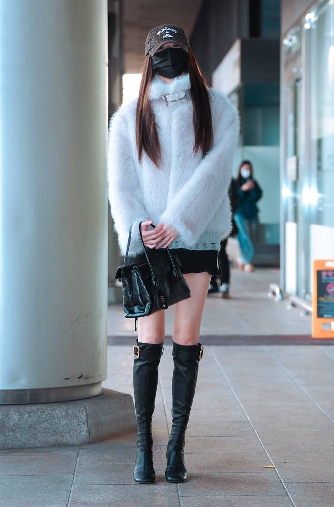 이날 장원영은 화이트 페이크 퍼 코트와 미니 스커트를 매치한 하의실종 시어링 프렌치룩으로 각선미를 뽐냈다.