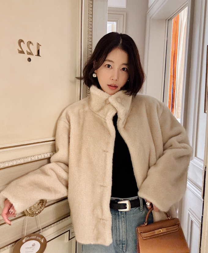 ▶ 채정안은 폭신한 느낌의 볼륨감이 눈에 띄는 하이넥 페이크 퍼 시어링 코트룩으로 매력적인 겨울 데일리룩을 연출했다.