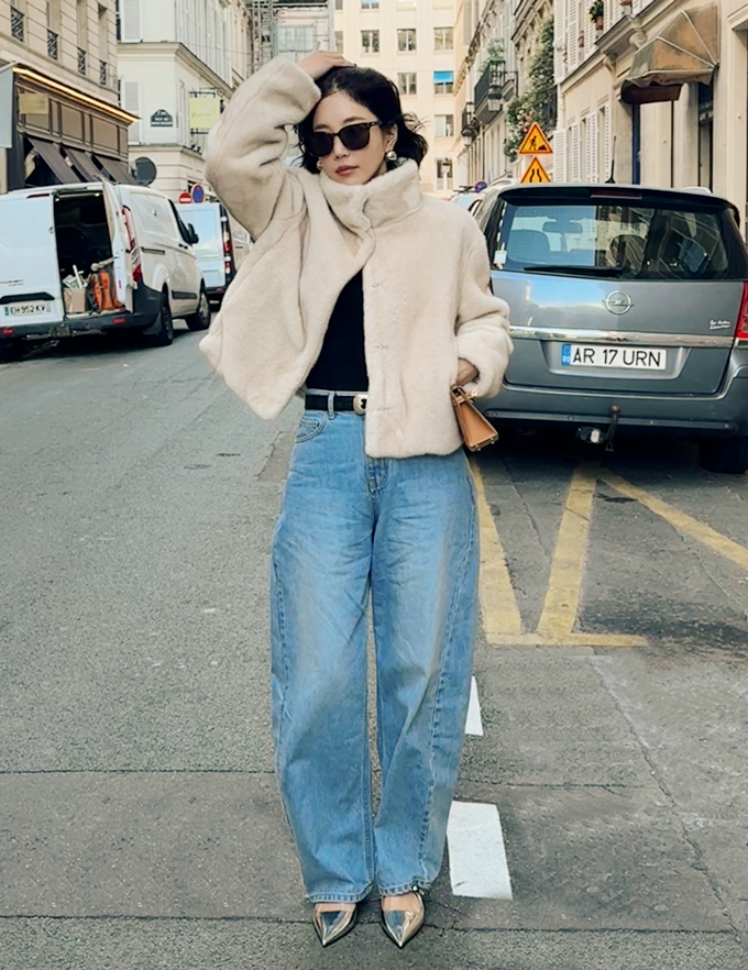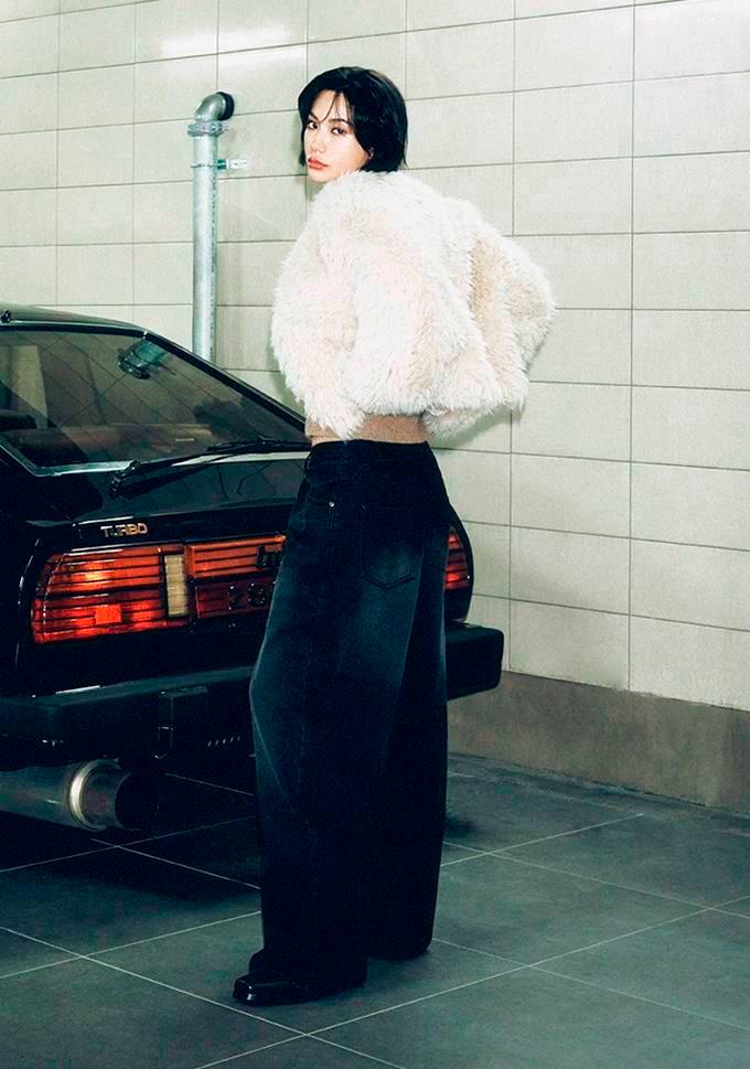 ▶ 나나는 볼륨감 있는 텍스처가 돋보이는 화이트 페이크 퍼 크롭 재킷으로 스타일리시한 겨울 아우터룩을 연출했다.