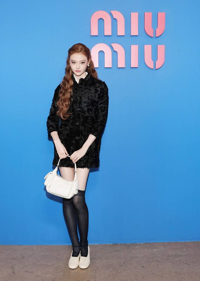 ▶ 미야오 엘라는 파리 패션위크 미우 미우 컬렉션에서 블랙 시어링 재킷과 미니스커트, 발레리나 힐과 나파 가죽 포켓백으로 키치한 감성을 발산했다.