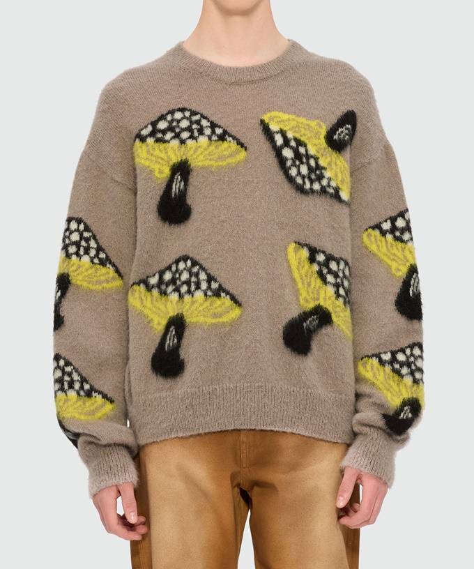 헤어리한 텍스처가 돋보이는 니트 풀오버는 앞면과 소매에 유니크한 버섯 패턴, 뒷면에는 미니멀한 MSGM 로고 라벨 디테일이 더해져 대담하고 개성 있는 무드를 더한다.