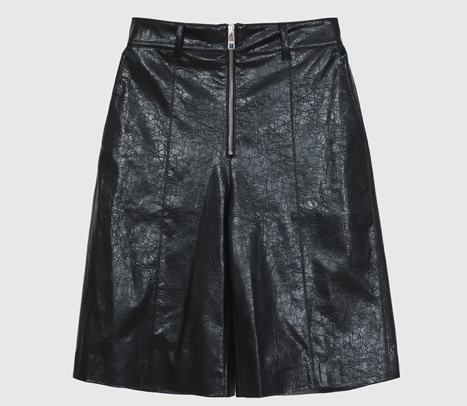 하지원이 착용한 블랙 반바지는 강렬한 텍스처와 고급스러운 광택이 돋보이는 페이크 레더 팬츠로 내추럴한 링클감이 유니크하면서도 시크한 분위기를 자아낸다.